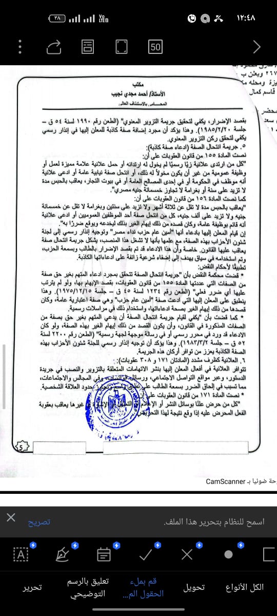 التزوير المعنوي وانتحال صفة رسمية على أوراق: فوجئ الطالب بأن المعلن إليها الأولى، وبقصد الإضرار به وبمكانته، قد قامت بالادعاء كذبًا وبغير وجه حق بأنها تشغل منصب “أمين عام حزب نداء مصر”. وقد تجاوزت مجرد الادعاء الشفهي، لتضع هذه الصفة المزيفة والمزورة على أوراق رسمية، حيث قامت بتوجيه إنذار رسمي إلى لجنة شئون الأحزاب مستخدمةً هذه الصفة الكاذبة. علمًا بأنها لم تشغل هذا المنصب في أي وقت من الأوقات، وأنها تعلم تمام العلم بوجود أمين عام آخر للحزب وفقًا للإجراءات الرسمية والقانونية. إن قيامها بانتحال هذه الصفة، وتدوينها على محرر رسمي كالإنذار الموجه لجهة رسمية، وتوجيه مراسلات رسمية بموجبها، يمثل جريمة تزوير معنوي وجريمة انتحال صفة يعاقب عليها القانون، ويدل على سوء نيتها وإصرارها على ارتكاب الأفعال غير القانونية للإضرار بالآخرين.