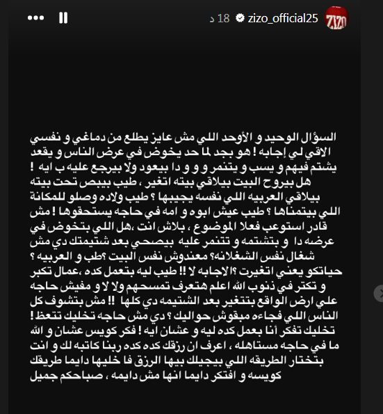 وقال أحمد سيد زيزو في تدوينة له عبر قصة في موقع التواصل الاجتماعي إنستجرام: “السؤال الوحيد والأوحد اللي مش عايز يطلع من دماغي ونفسي ألاقي لي إجابة! هو بجد لما حد يخوض في عرض الناس ويقعد يشتم فيهم ويسب ويتنمر و و ودا بيعود ولا بيرجع عليه بإيه!”