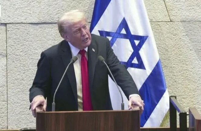 ظهر خلال إلقاء الرئيس الأمريكي، دونالد ترامب، أمام أعضاء الكنيست الإسرائيلي قيام شخصان من أعضاء الكنيست برفع لافتة “إبادة جماعية”، وتم السيطرة عليهما وطردهما من الجلسة.