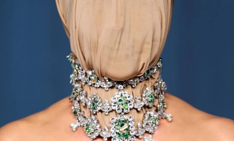 كيم كارداشيان ارتدت قناع أسود غطى وجهها بالكامل، بتصميم من دار ميزون مارجيلا، ضمن مجموعة هوت كوتور من إبداع المصمم غلين مارتنز.