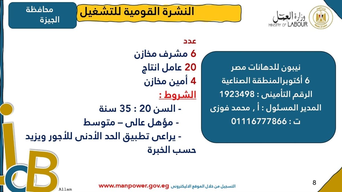أعلنت وزارة العمل اليوم الجمعة عن إصدار نشرة التوظيف نصف الشهرية، متضمنة 6721 فرصة عمل جديدة متاحة للشباب الباحث عن عمل في القطاع الخاص، وذلك بالتعاون مع 107 شركات في 16 محافظة مختلفة على مستوى الجمهورية، وتأتي هذه الخطوة في إطار جهود الدولة المستمرة لتوفير فرص عمل لائقة ودمج مختلف فئات المجتمع، بما في ذلك ذوو الهمم، في سوق العمل.
