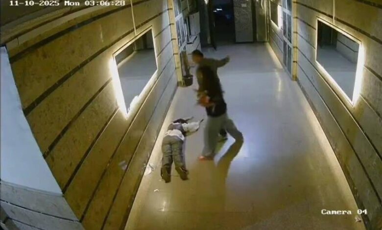 ووثّق الفيديو، الذي التقطته كاميرات المراقبة عند مدخل العقار، لحظة اعتداء الشاب والفتاة على فتاة صغيرة. وعندما حاولت الفتاة الدفاع عن نفسها وصدت ضربات الفتاة الأخرى، دفعها الشاب بقوة نحو الحائط، فاصطدم رأسها بالسطح وسقطت أرضًا.
