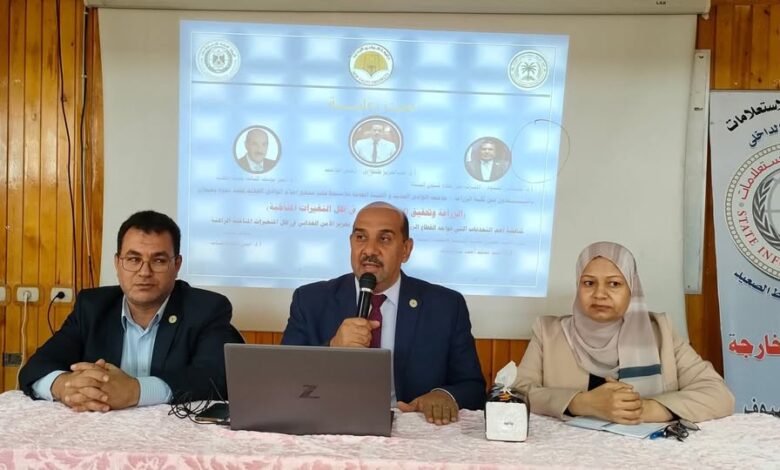 نظم مجمع إعلام الوادي الجديد اليوم الثلاثاء 25/11/2025 حلقة نقاشية بكلية الزراعة بحضور ا. د أيمن كساب عميد الكلية وا. د أحمد عبد المنعم وكيل الكلية لشئون خدمة المجتمع وتنمية البيئة و وأعضاء هيئة التدريس والهيئة المعاونة وعدد من الطلاب فى إطار محور التربية البيئية ومكافحة تغير المناخ وبرعاية الكاتب الصحفي ضياء رشوان رئيس الهيئة العامة للاستعلامات وتوجيهات الدكتور أحمد يحيى رئيس قطاع الإعلام الداخلى