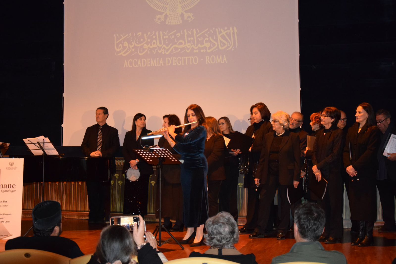 وشهدت الأمسية مفاجأة خاصة للجمهور، حيث قدّمت قائدة الكورال مقطوعة موسيقية غنائية بعنوان “سلام لكِ أم الدنيا”، في تحية رمزية للدور المصري الرائد وتجسيدًا لعمق العلاقات المصرية–الإيطالية عبر العصور. وقد شاركت الدكتورة رانيا يحيى، مديرة الأكاديمية، بالعزف على آلة الفلوت مع الكورال أثناء أداء هذه المقطوعة التي أهدتها المؤلفة إلى مصر احتفاءً بهذه المناسبة الثقافية الكبرى وتقديرًا للدور المصري الملهم، خاصة في أعقاب افتتاح المتحف المصري الكبير.