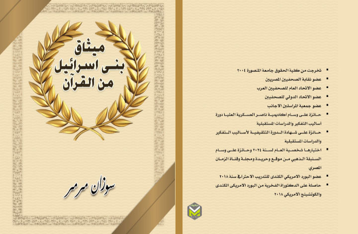 يصدر قريبا بدور النشر كتاب ميثاق بنى اسرائيل من القرآن الكريم للكاتبة سوزان مرمر عضو الاتحاد العام للصحفيين العرب وعضو الاتحاد الدولى للصحفيين