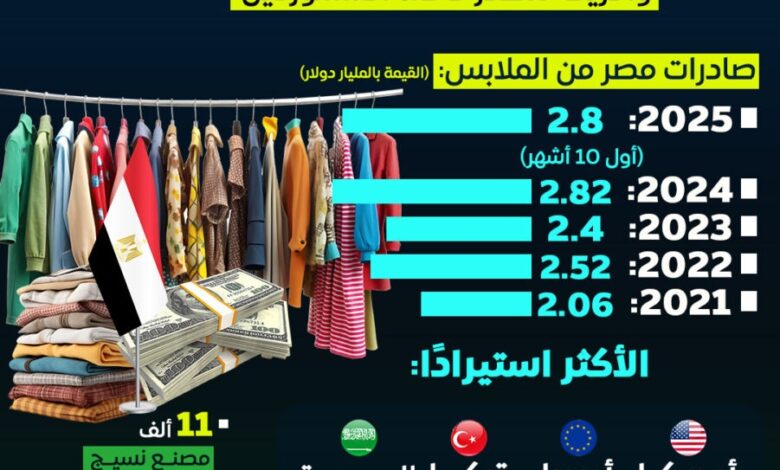 وأظهرت أحدث البيانات وفقًا لماعت جروب تسجيل صادرات الملابس المصرية نموًا ملحوظًا خلال السنوات الأخيرة، حيث بلغت قيمة الصادرات نحو 2.8 مليار دولار خلال أول عشرة أشهر من عام 2025، مقارنة بـ2.82 مليار دولار في عام 2024، و2.4 مليار دولار في 2023، في مؤشر واضح على استقرار الأداء التصاعدي للقطاع، رغم التحديات الاقتصادية العالمية.