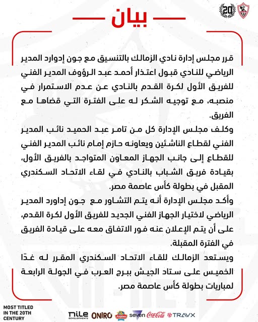 قرر مجلس إدارة نادي الزمالك بالتنسيق مع جون إدوارد المدير الرياضي للنادي قبول اعتذار أحمد عبد الرؤوف المدير الفني للفريق الأول لكرة القدم بالنادي عن عدم الاستمرار في منصبه، مع توجيه الشكر له على الفترة التي قضاها مع الفريق.