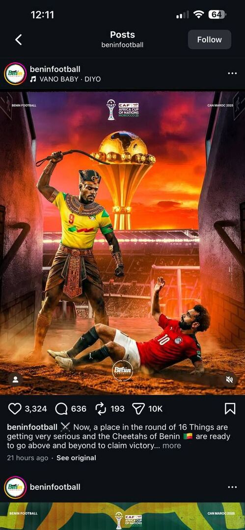 البداية كانت من حسابات تحمل اسم «Bénin Football» على منصتي “فيسبوك” و”إنستجرام”، حيث تم نشر تصميم تم إنتاجه بواسطة تقنيات الذكاء الاصطناعي كدعاية للمباراة. وظهر في الصورة لاعب من منتخب بنين يرتدي زي الملوك المصريين القدماء (الفراعنة)، ممسكاً بـ “كرباج”، بينما يظهر النجم العالمي وقائد المنتخب المصري محمد صلاح مستلقياً على الأرض أمامه بملامح يكسوها الرعب والقلق.