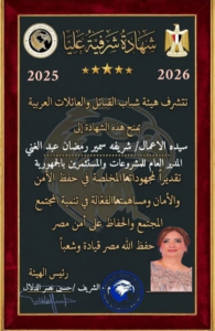 وأيضًا اتقدم بجزيل الشكر لمنحى شهادة تقدير شرفية عليا من السيد المهندس الشريف / حسين بك الدلال  رئيس مجلس ادارة هيئة شباب القبائل والعائلات العربيةوالسيد الفاضل الأمين العام  و العمدة / صالح المغوارى وخالص تحياتي لجميع القبائل العربية وان شاءالله اكون عند حسن ظن حضراتكم ونتعاون معا من أجل خدمة وطننا الحبيب مصر