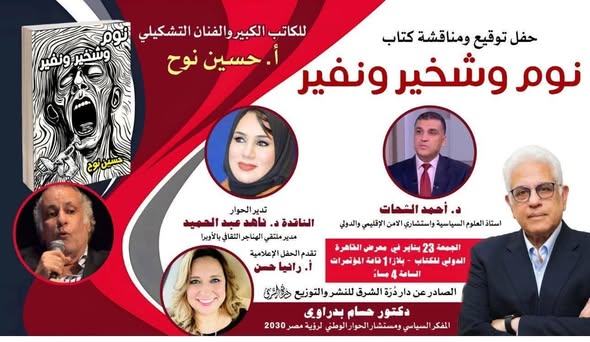 يقام في الرابعة عصر الجمعة المقبل، 23 يناير الجاري، حفل توقيع ومناقشة كتاب “نوم وشخير ونفير” للفنان التشكيلي والناقد حسين نوح، بقاعة المؤتمرات في بلازا 1، وذلك ضمن فعاليات معرض القاهرة الدولي للكتاب في دورته السابعة والخمسين.
