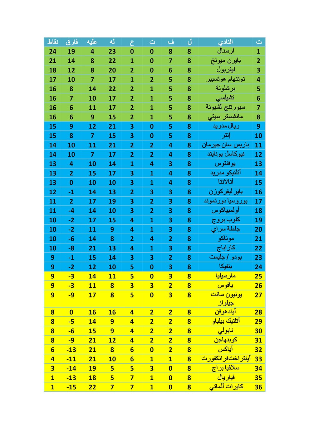 وأنهى أرسنال الإنجليزي منافسات مرحلة الدوري لمسابقة دوري أبطال أوروبا في المركز الأول برصيد 24 نقطة ويليه بايرن ميونخ ثانيا برصيد 21 نقطة.