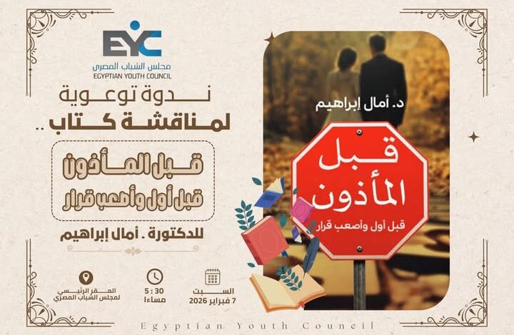 يُعلن البرنامج الوطني لتعزيز الحق في التعليم تحت مظلة مجلس الشباب المصري عن إقامة ندوة توعوية لمناقشة كتاب: «قبل المأذون قبل أول وأصعب قرار » للكاتبة المتميزة /الدكتورة أمال إبراهيم استشاري العلاقات الأسرية