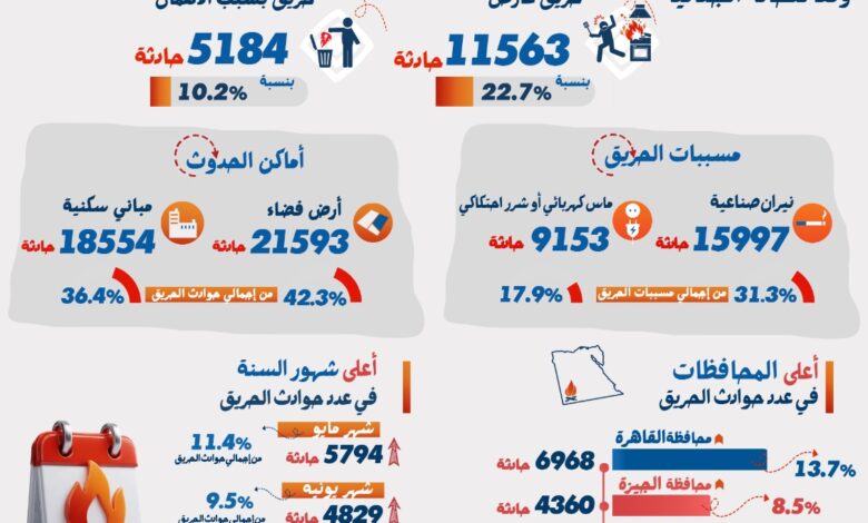 بلـغ عـدد حوادث الحريق عـلى مستـوى الجمهورية 51029 حادثة عام 2025، مقابل 46925 حادثة عام 2024 بنسبة ارتفاع قدرها 8,7%.