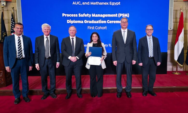 القاهرة، 11 فبراير 2026 – احتفلت الجامعة الأمريكية بالقاهرة اليوم بتخريج 32 خبيراً متخصصًا في قطاع البترول يشكلون الدفعة الأولى من الدبلومة المهنية في إدارة سلامة العمليات، وذلك من خلال تعاون ثلاثي بين الجامعة ووزارة البترول والثروة المعدنية وشركة ميثانكس مصر. حضر حفل التخرج المهندس كريم بدوي، وزير البترول والثروة المعدنية، والدكتور أحمد دلاّل، رئيس الجامعة الأمريكية بالقاهرة، وريتش سومنر، الرئيس التنفيذي العالمي لشركة ميثانكس، ومحمد شندي، العضو المنتدب لشركة ميثانكس، والدكتور لطفي جعفر، عميد كلية العلوم والهندسة بالجامعة، والمهندس ياسين محمد، وكيل أول وزارة البترول والثروة المعدنية، والمهندس علاء الدين عبد الفتاح، رئيس مجلس إدارة الشركة المصرية القابضة للبتروكيماويات ولفيف من قيادات قطاع البترول والغاز والجامعة.