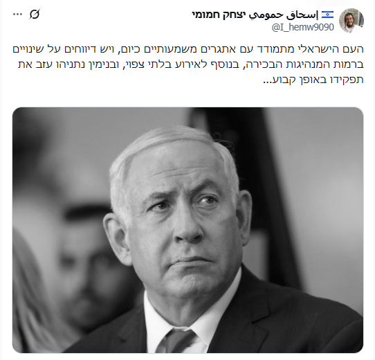 وأزداد الأمر سخونة عندما علق المستوطن الإسرائيلي إسحق عمومي، فقال: “يواجه الشعب الإسرائيلي تحديات كبيرة اليوم، وهناك تقارير عن تغييرات في أعلى مستويات القيادة، بالإضافة إلى حدث غير متوقع، حيث ترك بنيامين نتنياهو منصبه نهائيًا”.