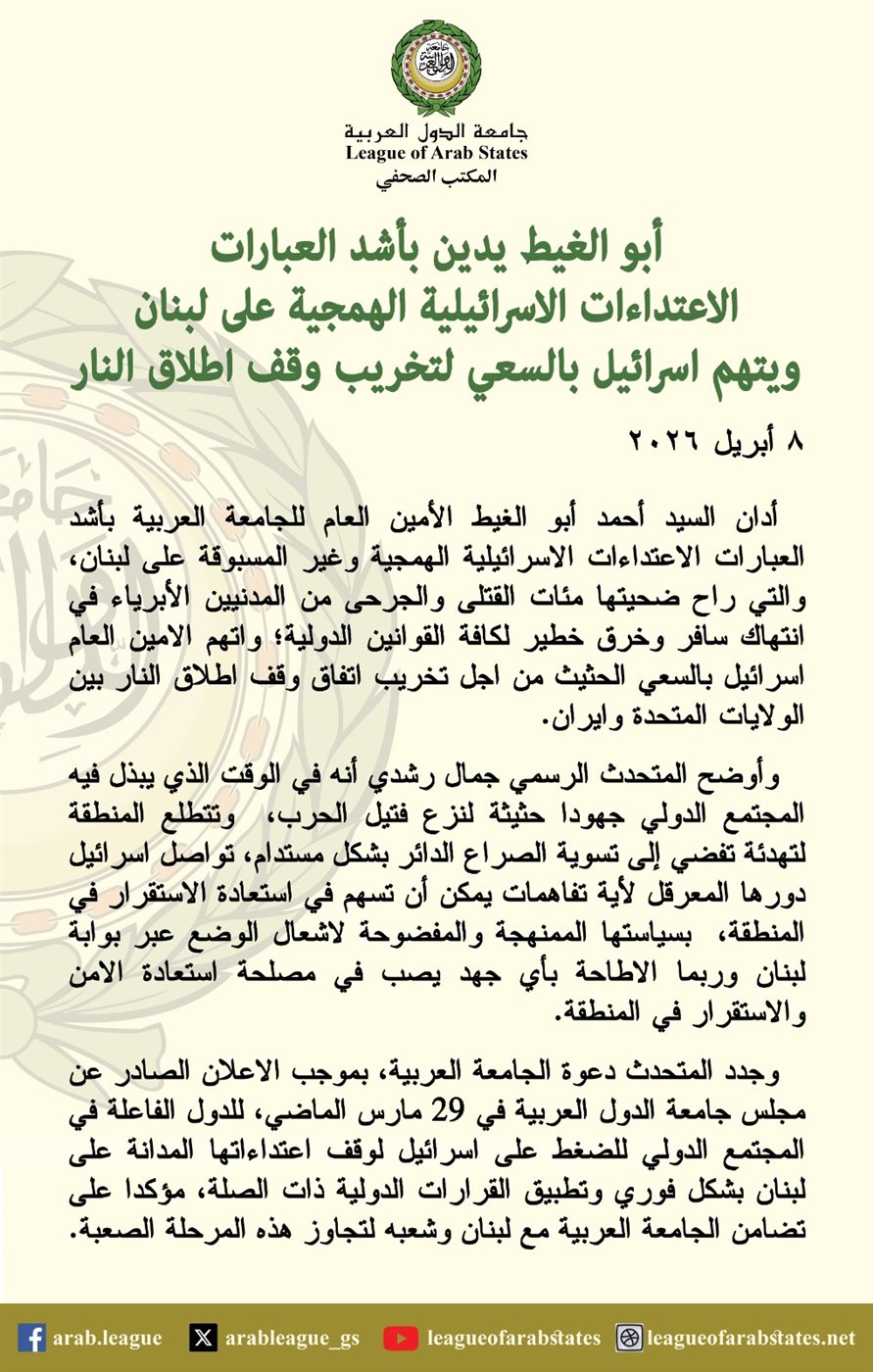 أدان أحمد أبو الغيط ا لأمين العام للجامعة العربية بأشد العبارات الاعتداءات الإسرائيلية الهمجية وغير المسبوقة على لبنان والتي راح ضحيتها مئات القتلى والجرحى من المدنيين الأبرياء في انتهاك سافر وخرق خطير لكافة القوانين الدولية؛ واتهم الأمين العام إسرائيل بالسعي الحثيث من أجل تخريب اتفاق وقف إطلاق النار بين الولايات المتحدة وإيران.