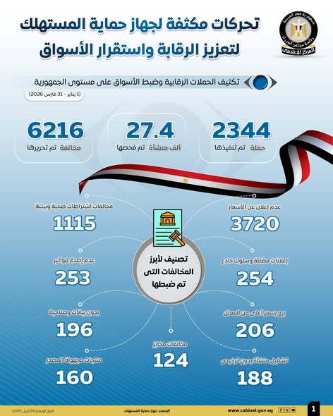 وسلطت الإنفوجرافات الضوء على الحملات الرقابية المكثفة لضبط الأسواق على مستوى الجمهورية، وذلك خلال الفترة من 1 يناير حتى 31 مارس 2026، حيث تم تنفيذ 2344 حملة، وكذلك فحص 27.4 ألف منشأة، وقد أسفرت الحملات عن تحرير 6216 مخالفة.